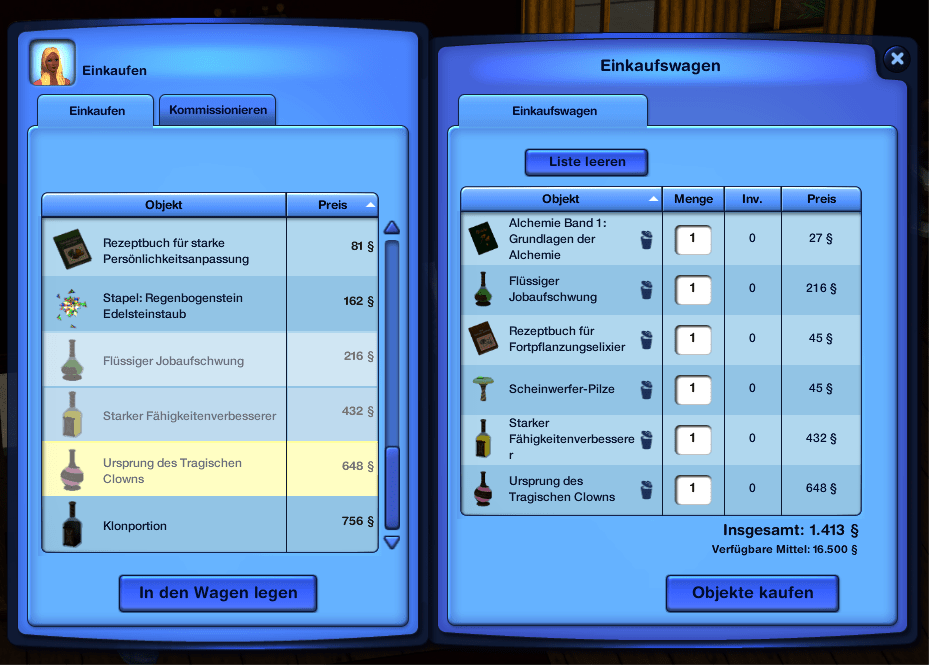 The alchemist building offers different ways to learn the art of mixing elixirs. I wasn’t able to test out all of them. Alchemy is open to every Sim (even Zombies). In the alchemy store you can study and mix potions yourself on the big alchemy table or simply buy them at the cashier. Once you have an elixir, you don’t need any special knowledge to use it. To make your own elixirs, you need to have the most of the ingredients in your inventory. They are not provided. You can find them around town or plant them yourself.