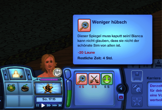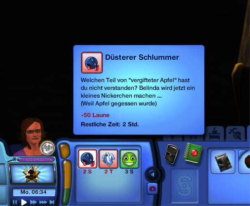 One of the first spells they learn is to summon an apple and then to poison it. Eating a poison apples have the side effect to become very very tired and therefore my Sims idea to eat the apple herself, wasn’t her best move. When she later lost a duel against her sister and was less beautiful afterwards, her day was ruined.