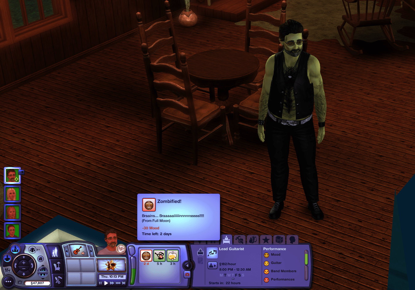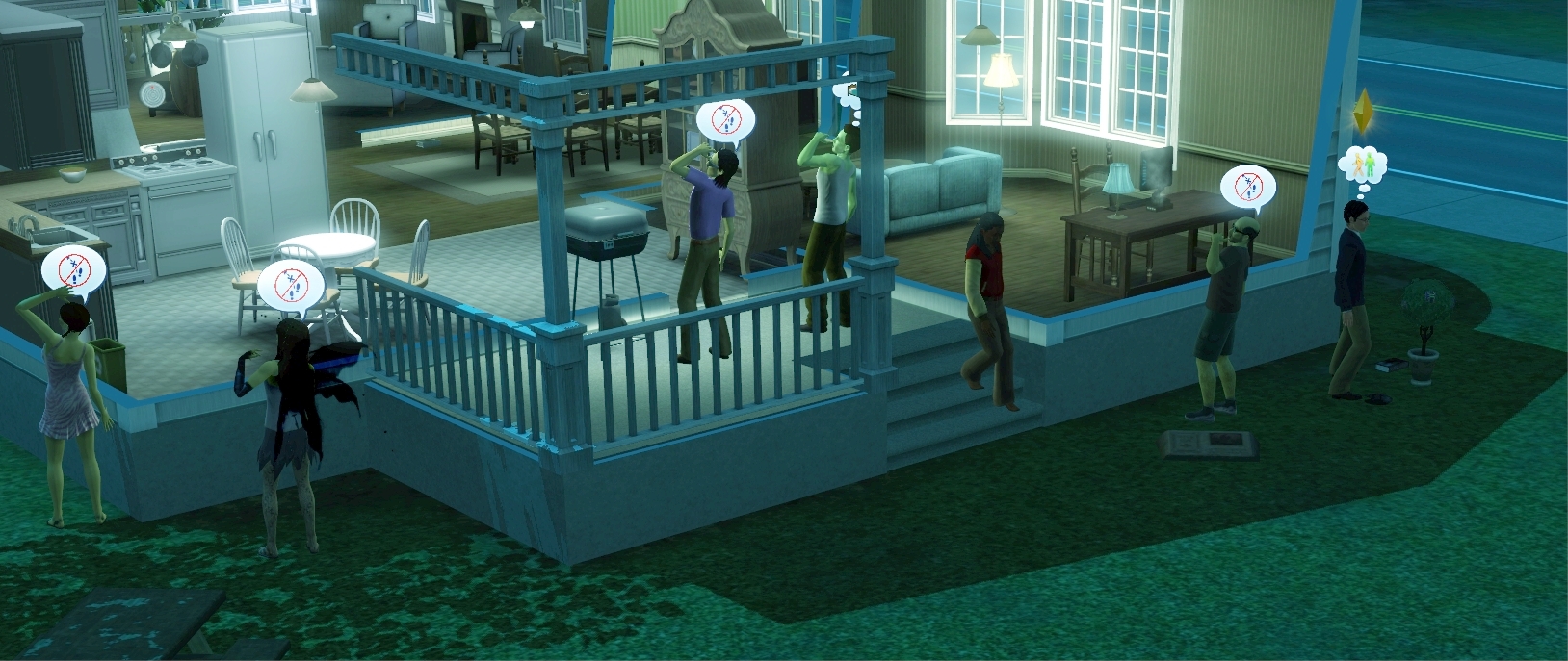 By the end of the evening, I had about 10 zombies standing around my house that all wanted to attack my Sim. Since they couldn’t get into my house they were standing outside, waving their arms – I can only fear the routing failure lags coming with that.