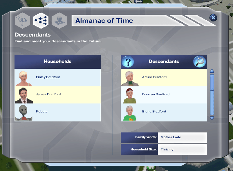 Die Verwandtschaft in der Zukunft ist durch ein spezielles Icon gekennzeichnet und der Wohnort kann direkt über das Lupen-Icon im Zeitalmanach eruiert werden. Einem baldigen Besuch bei der Verwandtschaft steht also nichts im Weg. Auch in der Bekanntschaftsliste werden die neugewonnen ‚Freunde‘ mit einem speziellen Icon gekennzeichnet. Im eigenen Stammbaum tauchen sie allerdings nicht auf. Den Stammbaum der Nachfahren konnte ich nicht inspizieren.