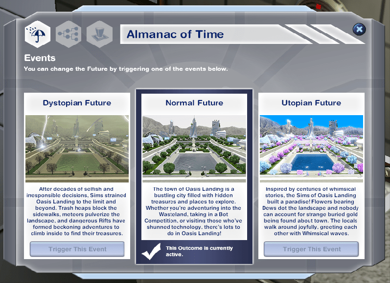 Aktionen in der Gegenwart haben Auswirkungen auf die Zukunft. Dies zeigt sich hauptsächlich darin, wie es in der Zukunft um die Nachfahren steht. Es ist aber auch möglich, die Zukunft für alle Sims zu verändern. Oasis Landing sieht dann sehr unterschiedlich aus.