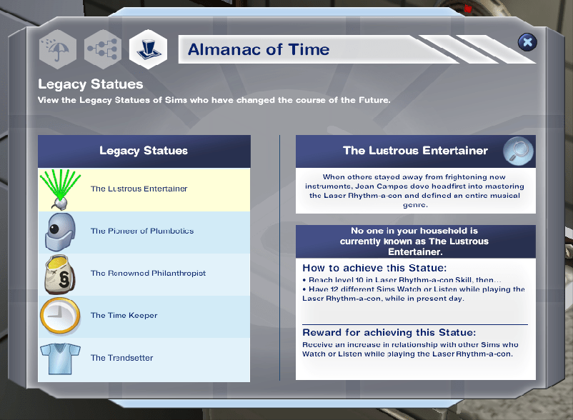 Die Zukunft zu ändern ist nicht wirklich schwierig und dürfte auf die Dauer auch etwas langweilig werden. Der Zeitreisende gibt deinem Sim dazu ein paar Aufgaben, die er erledigen muss und schon hat sich die Zukunft verändert. Mit Technologiefähigkeit 10 kann dann auch die normale Zeit wiederhergestellt werden, in dem dein Sim am Zeitportal das Zeitkontinuum repariert.