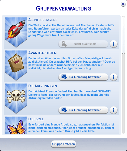 Es gibt 11 vorgefertigte Gruppen in der Stadt. Diese Gruppen können aussterben, wenn du nicht aktiv neue Mitglieder hinzufügst. Es gibt nur zwei Gründe, wieso ein inaktives Mitglied einer Gruppe verlässt: Der Sim erfüllt die Anforderungen der Gruppe nicht mehr oder er stirbt. Inaktive Sims treten nicht aktiv einer Gruppe bei, sondern nur auf Initiative des Spielers. Wenn eine Gruppe keine Mitglieder mehr hat, wird sie automatisch durch eine neue (nicht identische) ersetzt.